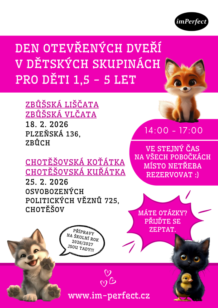 Den otevřených dveří se bude konat 25. 2. ve stejný čas také v Chotěšově v dětských skupinách Chotěšovská kuřátka a Chotěšovská koťátka.