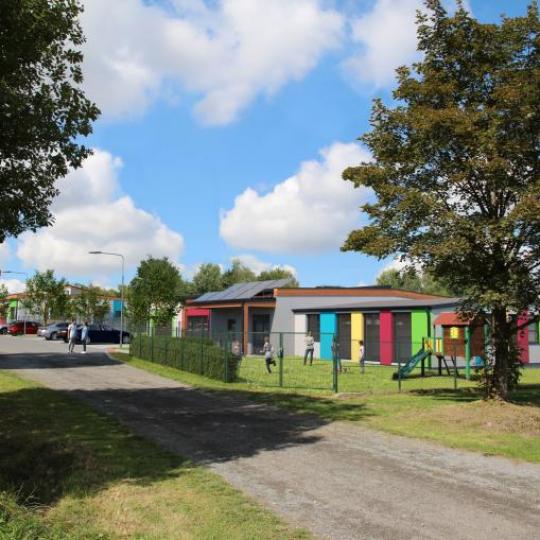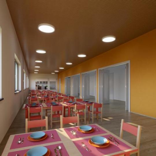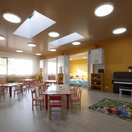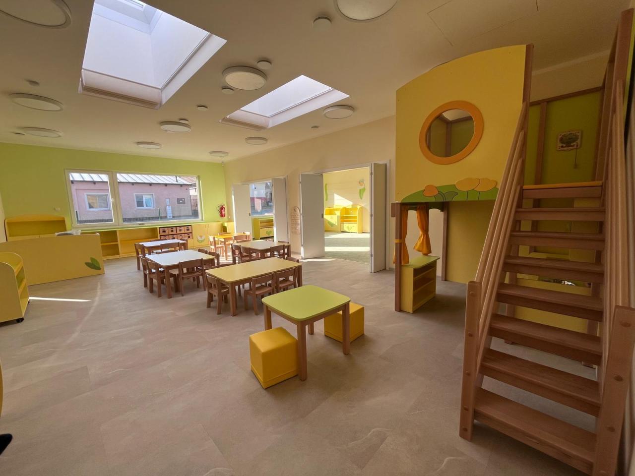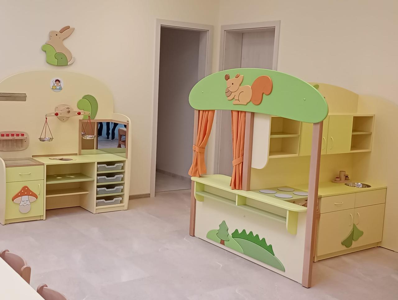 První budova nové školky byla dokončena v únoru 2025 a do 10. března se do ní přestěhovalo 100 dětí ze staré školky. Je to prostorná a prosvětlená dřevostavba s kvalitním vybavením. Architekti kladli důraz na celkovou příjemnou barevnost a na kvalitu a design veškerého vybavení. Dětský nábytek i herní prvky jsou vyrobeny z masivního dřeva a jsou ekologicky nezávadné.